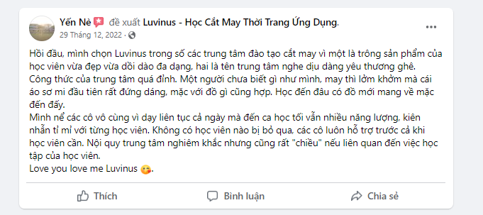 Trần Thị Thanh Tuyền chia sẻ: “Môi trường học tập đầy sáng tạo, cơ sở vật chất hiện đại, giảng viên giàu kinh nghiệm, Luvinus là môi trường học tập tốt nhất giúp tôi hiện thực hóa giấc mơ trở thành nhà thiết kế thời trang của mình.”.